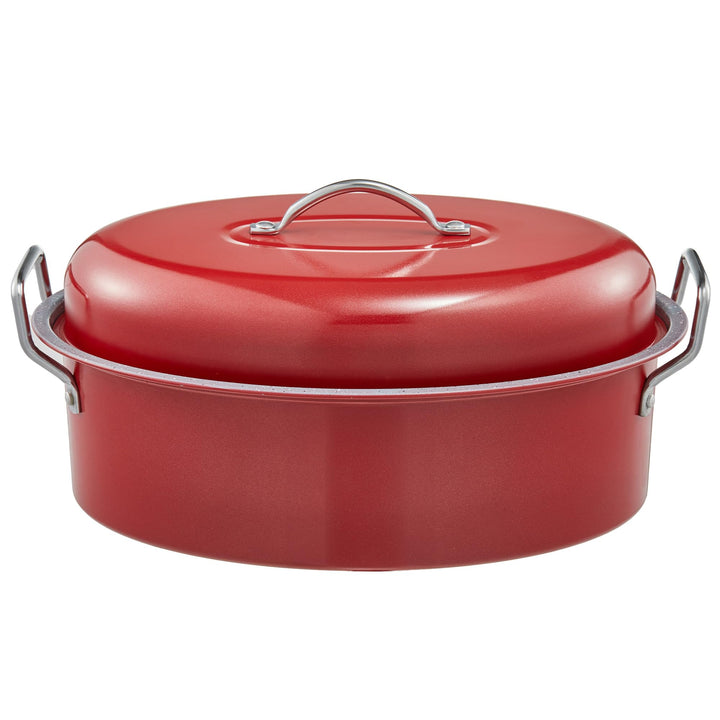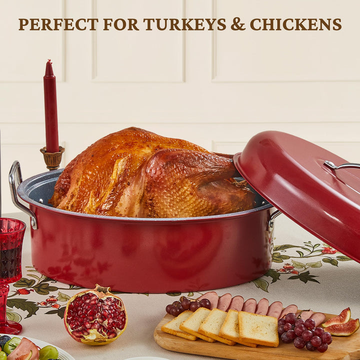 HONGBAKE 18 Inch Turkey Roasting Pan with Rack and Lid – Extra Large Red Carbon Steel Roaster Pan for 25 lb Turkey, Heavy Duty Nonstick, Oven Safe Baking Pan for Holiday Meals & Thanksgiving, Red