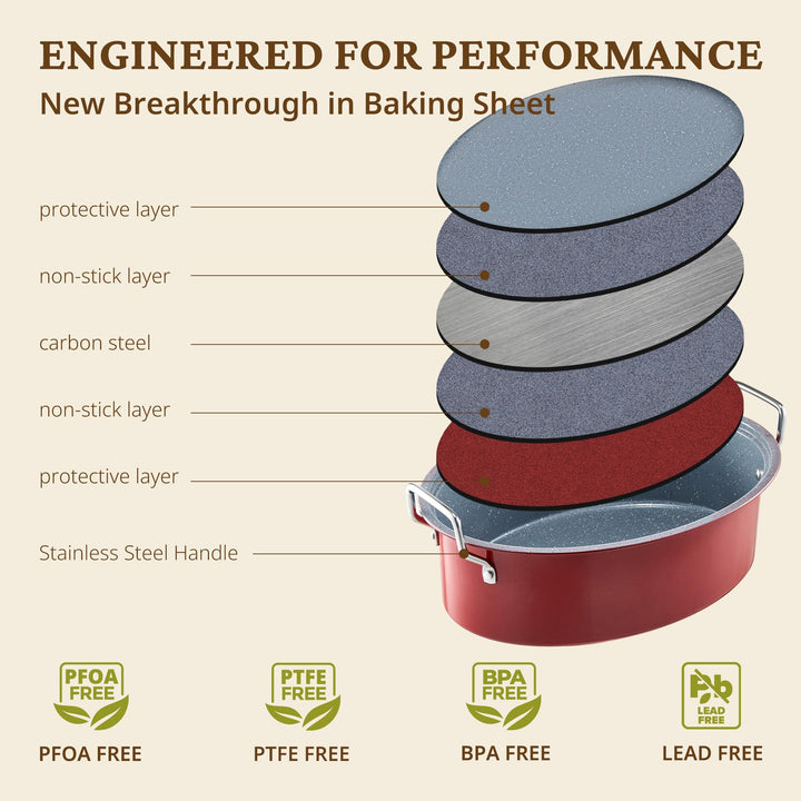 Premium Granite Non-Stick Coating: Featuring an upgraded luxury granite non-stick coating, our turkey pan keeps food intact while making cleanup effortless. This innovative surface absorbs and distributes heat evenly, speeding up cooking time while sealing in moisture for mouthwatering results. Plus, our roasting pan with lid is free from harmful chemicals like PFOA and PTFE, ensuring a safe cooking experience that won’t react with acidic foods.
