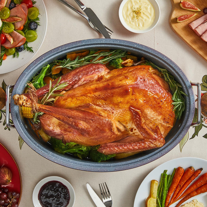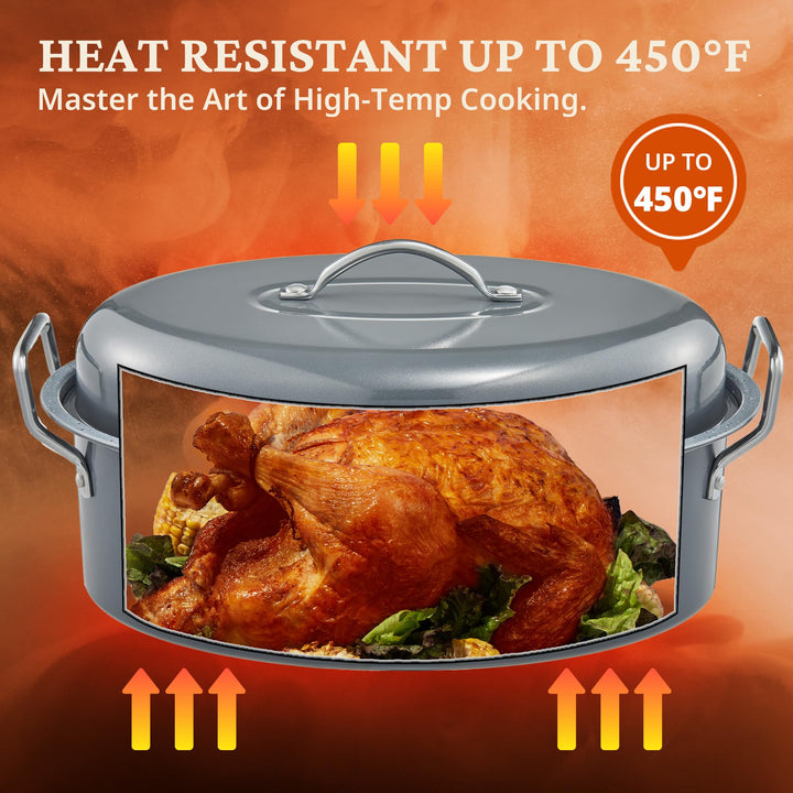 ✨【Non-Toxic & Durable】Our turkey roasting pan contains three layers of non-stick coating with a granite coating made from natural minerals to ensure a non-toxic cooking experience. It utilizes advanced plasma coating technology, which uses high-temperature plasma gas to apply the coating material, resulting in a highly durable surface that's resistant to peeling. This technology provides exceptional non-stick performance that lasts for years.