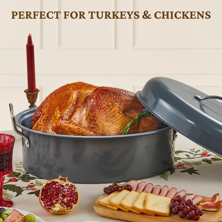 🛒【Includes Lid & Rack】This versatile large turkey roasting pan features a snug-fitting dome lid that locks in moisture, keeping your food tender and juicy. It also includes a rack that elevates your turkey for perfect crispiness. The pan's edges are smooth and safe, so you won't have to worry about sharp edges.Combining functionality with convenience and safety, it's a must-have for your kitchen.