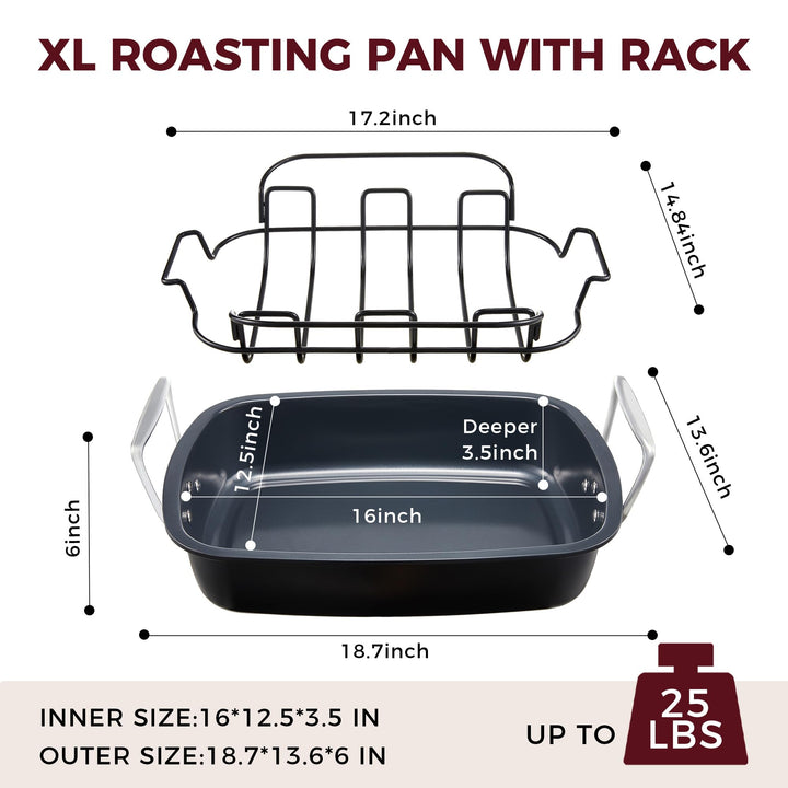 ✨【PRECISE DIMENSIONS】This roasting pan with rack measures 18.7 x 13.6 x 6" outside (16 x 12.5 x 3.5" inside); tall 3.5" sides help reduce splatter, retain moisture, and protect oven cleanliness during holiday cooking.