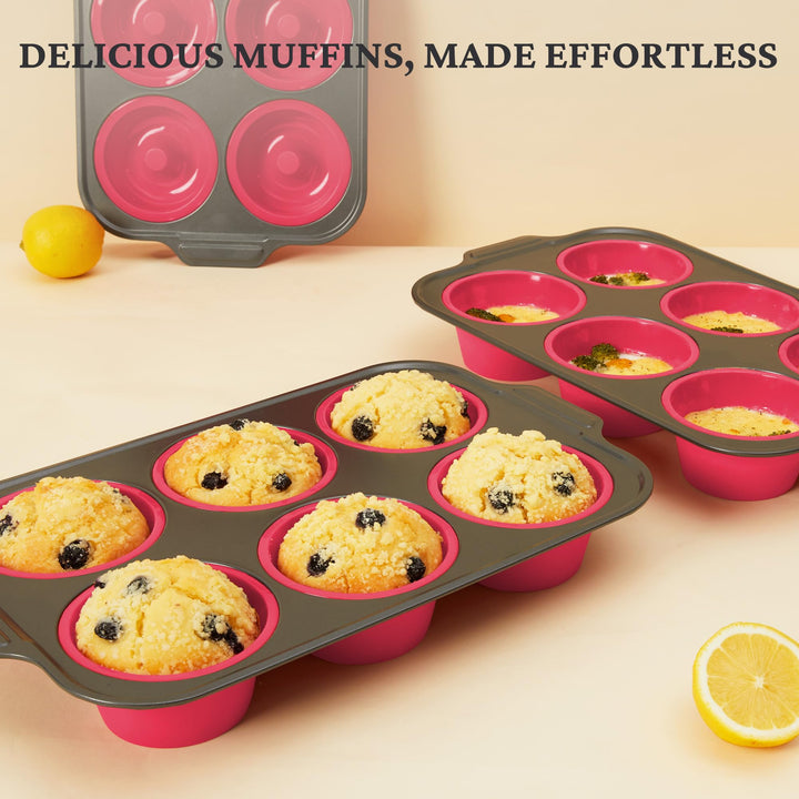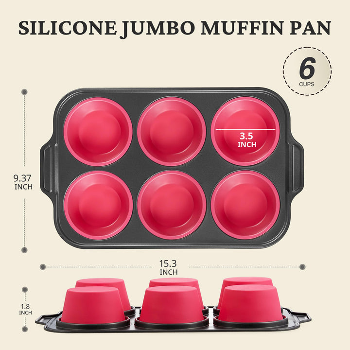 🥰【DURABLE CARBON STEEL FRAME】Our jumbo muffin pan features a robust carbon steel frame, providing superior support and stability. Unlike all-silicone pans, this hybrid design ensures the pan stays strong and maintains...