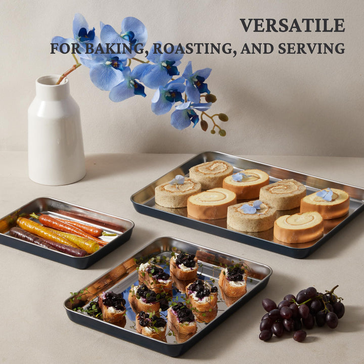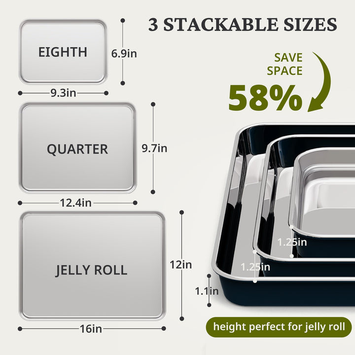 Versatile & Space-Saving: This stainless steel sheet pan set includes three sizes: Jelly Roll (16" x 12" x 1.1"), Quarter Sheet (12.4" x 9.7" x 1.25"), and Eighth Sheet (9.3" x 6.9" x 1.25"). Each pan has 1.1-inch-deep rims to prevent spills, perfect for baking jelly rolls, cookies, macarons, roasted veggies, and more. Stackable design saves 58% storage space, making it ideal for everyday meals, holidays, new kitchens, or as a thoughtful housewarming or wedding gift.
