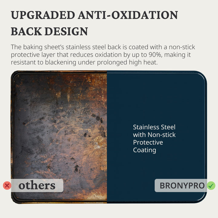 Upgraded Anti-Oxidation Bottom Design: Featuring an advanced back coating, our stainless steel cookie sheets for baking reduce oxidation by up to 90%, ensuring the stainless steel stays clean and resists darkening...