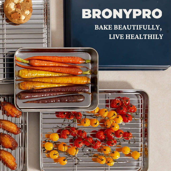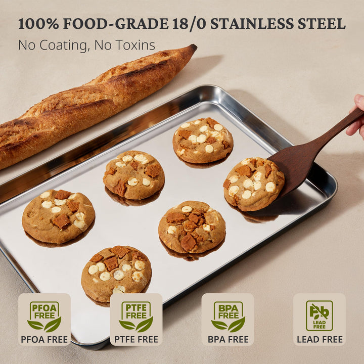 Upgraded Anti-Oxidation Bottom Design: Featuring an advanced back coating, our stainless steel cookie sheets for baking reduce oxidation by up to 90%, ensuring the stainless steel stays clean and resists darkening even under long-term high heat. Free from PTFE, PFOA, PFAS, PFOS, lead, and cadmium, they’re built for safe, healthy baking.
