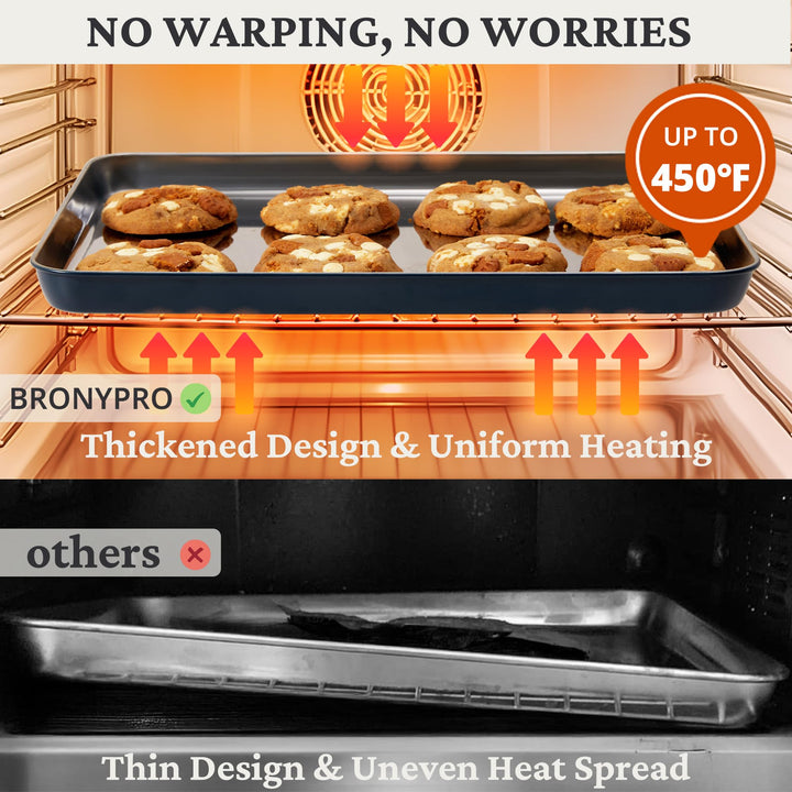 Warp-Free Design Up to 450°F: Made with 57% thicker stainless steel, these baking pans for oven resist warping at temperatures up to 450°F and ensure even heat distribution. These pans are suitable for parchment paper, silicone baking mats, and traditional methods using butter, shortening, or flour. Butter or cooking oil works best for roasting vegetables and other savory foods.