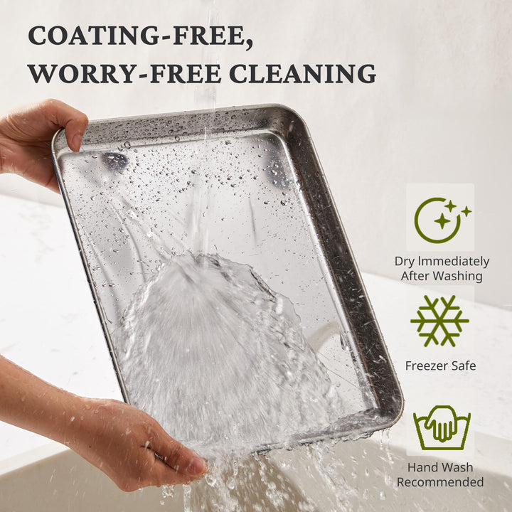 Uncoated Stainless Steel for Easy Cleaning: Our natural stainless steel baking sheets surface is uncoated, and will never peel. The mirror finish ensures easy food release, and rounded corners prevent residue buildup. Hand wash with warm soapy water before first use and after each use. Use nylon, wood, or silicone utensils; avoid metal or steel wool, as they may scratch the surface but won’t affect baking performance.