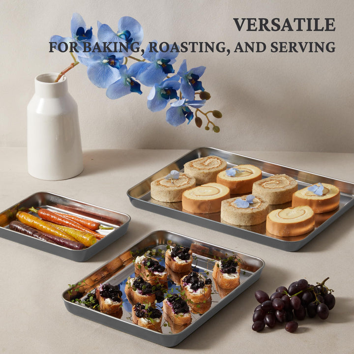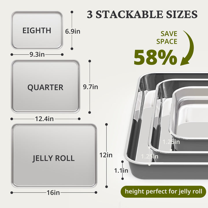 Versatile & Space-Saving: This stainless steel sheet pan set includes three sizes: Jelly Roll (16" x 12" x 1.1"), Quarter Sheet (12.4" x 9.7" x 1.25"), and Eighth Sheet (9.3" x 6.9" x 1.25"). Each pan has 1.1-inch-deep rims to prevent spills, perfect for baking jelly rolls, cookies, macarons, roasted veggies, and more. Stackable design saves 58% storage space, making it ideal for everyday meals, holidays, new kitchens, or as a thoughtful housewarming or wedding gift.
