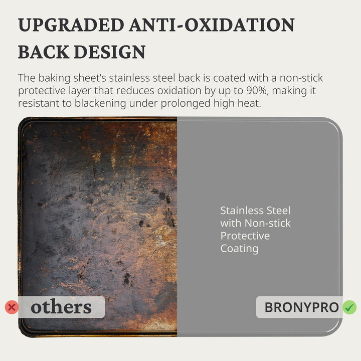Upgraded Anti-Oxidation Bottom Design: Featuring an advanced back coating, our stainless steel cookie sheets for baking reduce oxidation by up to 90%, ensuring the stainless steel stays clean and resists darkening...