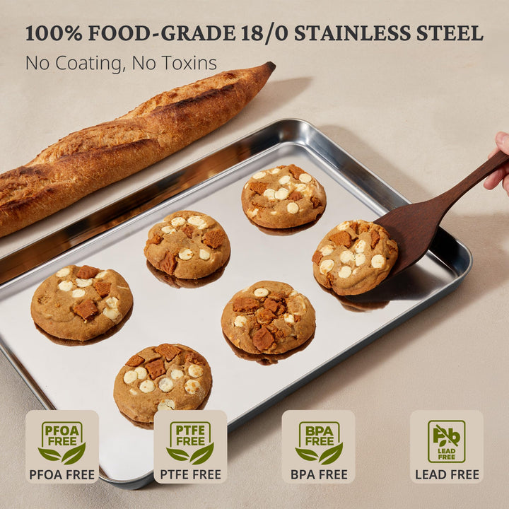 Upgraded Anti-Oxidation Bottom Design: Featuring an advanced back coating, our stainless steel cookie sheets for baking reduce oxidation by up to 90%, ensuring the stainless steel stays clean and resists darkening even under long-term high heat. Free from PTFE, PFOA, PFAS, PFOS, lead, and cadmium, they’re built for safe, healthy baking.