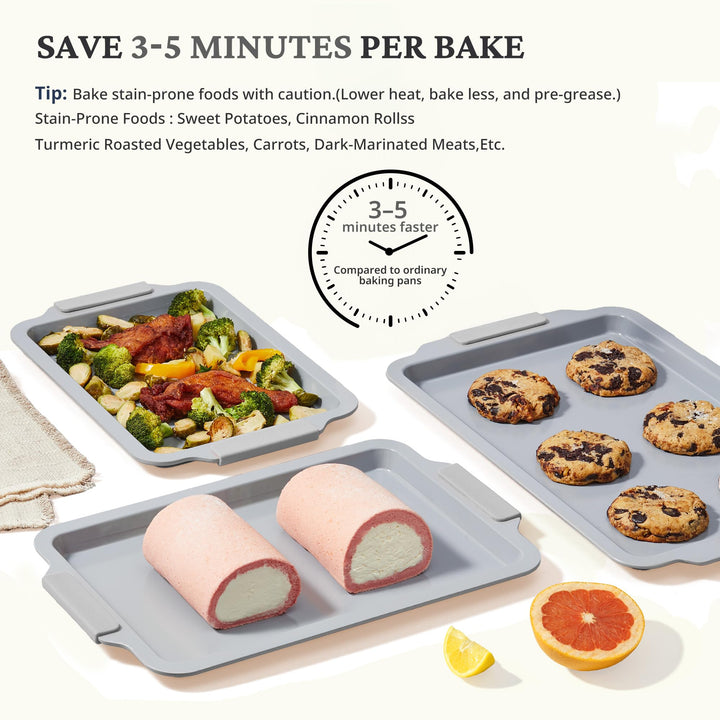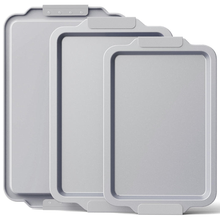 Non Stick Ceramic Baking Sheet Pan Set of 3, Natural Non Toxic Cookie Sheets for Baking, Heavy Duty Aluminized Steel Oven Trays for Cooking with Silicone Handles, Gray