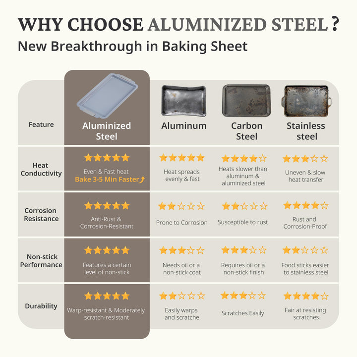 🎨【Upgrade to Heavy-Duty Aluminized Steel】Enjoy 50% more durability and 70% better heat distribution with our 0.6mm thick heavy-duty aluminized steel baking trays for oven. With superior rust resistance and nonstick performance, these trays outshine aluminum, carbon steel, and stainless steel. They can withstand up to 500°F, ensuring perfect baking results every time.
