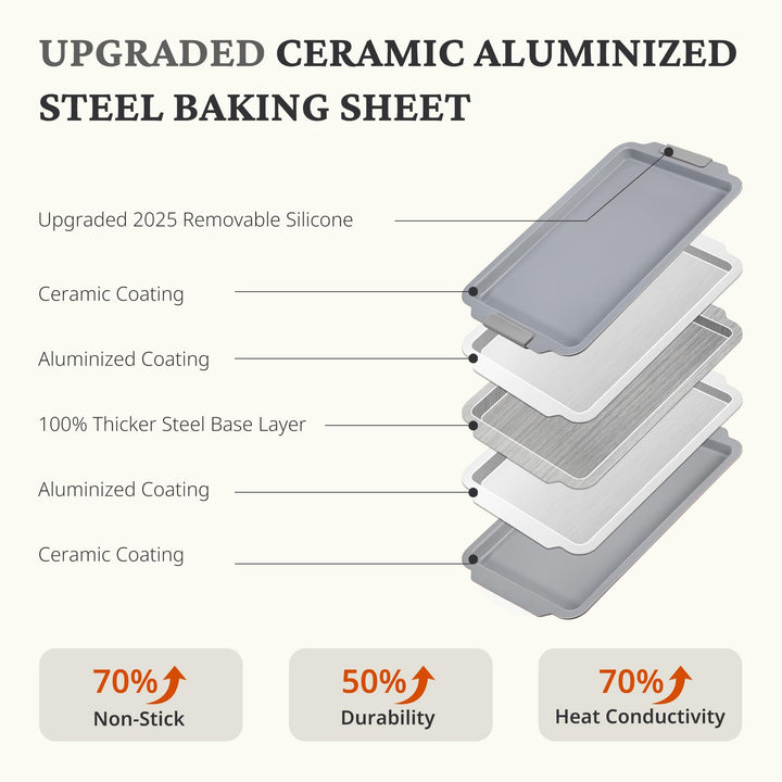 🛒【Easy to Clean & Durable】The ceramic-coated aluminized steel cooking sheets are a breeze to clean—just wipe away residue. Dishwasher safe, but hand washing is recommended. More durable than traditional coatings, they stay in top condition and look like new even after six months of regular use.