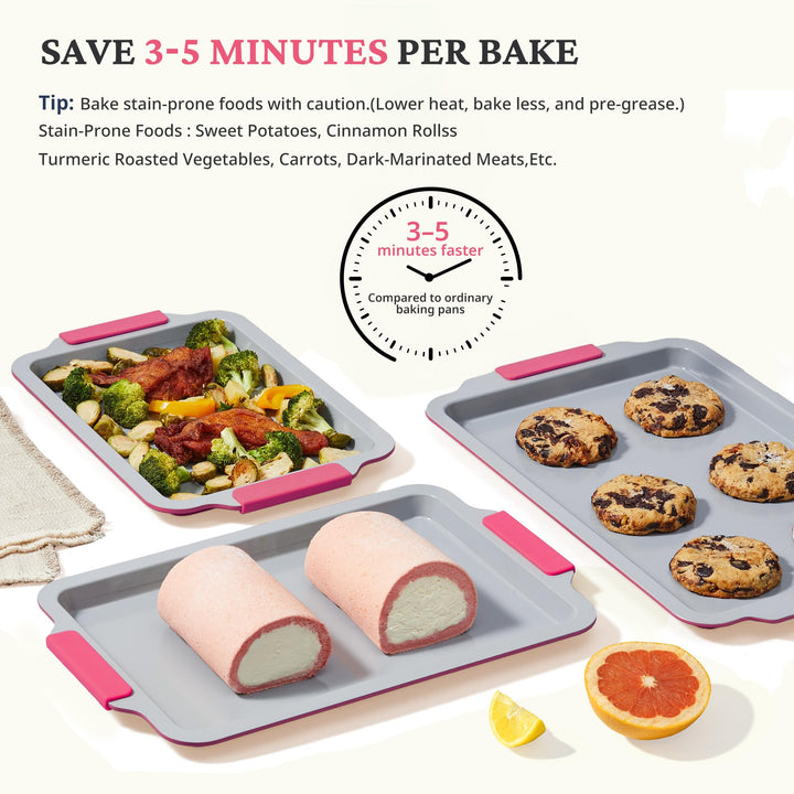 Non Stick Ceramic Baking Sheet Pan Set of 3, Natural Non Toxic Cookie Sheets for Baking, Heavy Duty Aluminized Steel Oven Trays for Cooking with Silicone Handles, Rose Red