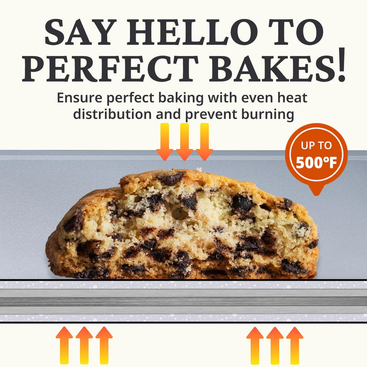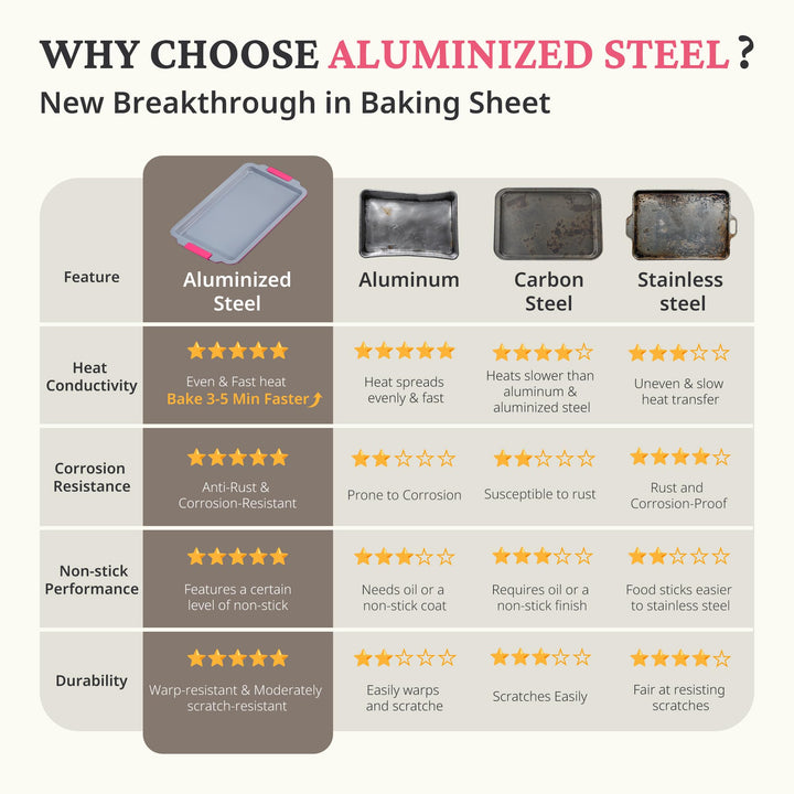 🎨【Upgrade to Heavy-Duty Aluminized Steel】Enjoy 50% more durability and 70% better heat distribution with our 0.6mm thick heavy-duty aluminized steel baking trays for oven. With superior rust resistance and nonstick performance, these trays outshine aluminum, carbon steel, and stainless steel. They can withstand up to 500°F, ensuring perfect baking results every time.